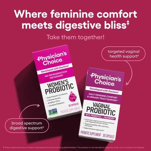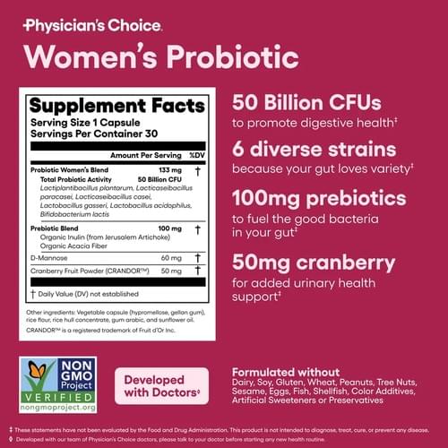 Physician's Choice Women's Probiotic is designed for digestive and feminine health. With 50 billion Colony Forming Units (CFUs) & 6 probiotic strains to support gut balance and urinary tract health. ๐ฆ 50B CFUs & 6 diverse strains to support regularity, overall wellness and immune health ๐บ Supports Feminine & Urinary Tract Health with ProCran (cranberry extract) and D-Mannose ๐ฟ Prebiotics to help fuel the good bacteria in the gut ๐ Delayed Release Acid-Resistant Capsules so probiotics make it to the gut ๐งด CSP Bottle keeps the strains protected & alive without refrigeration Product Use: Take 1 veggie capsule daily to support digestive and urinary health.Made in the USA with imported and domestic ingredients, cGMCP, and third-party tested for quality assurance, purity, and potency.